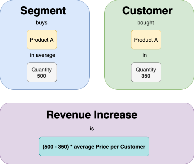 Formula = (average Quantity per Product and per Customer Segment - Quantity per Product and Customer) * average Price per Product and Customer
