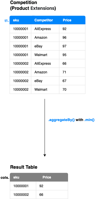 { cols -> [cols.sku, exprs.min(cols.Price).as("MinPrice")] })