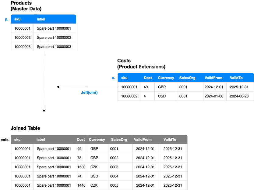 .leftOuterJoin(c, { cols -> [c.Cost, c.Currency, c.SalesOrg, c.ValidFrom, c.ValidTo] },